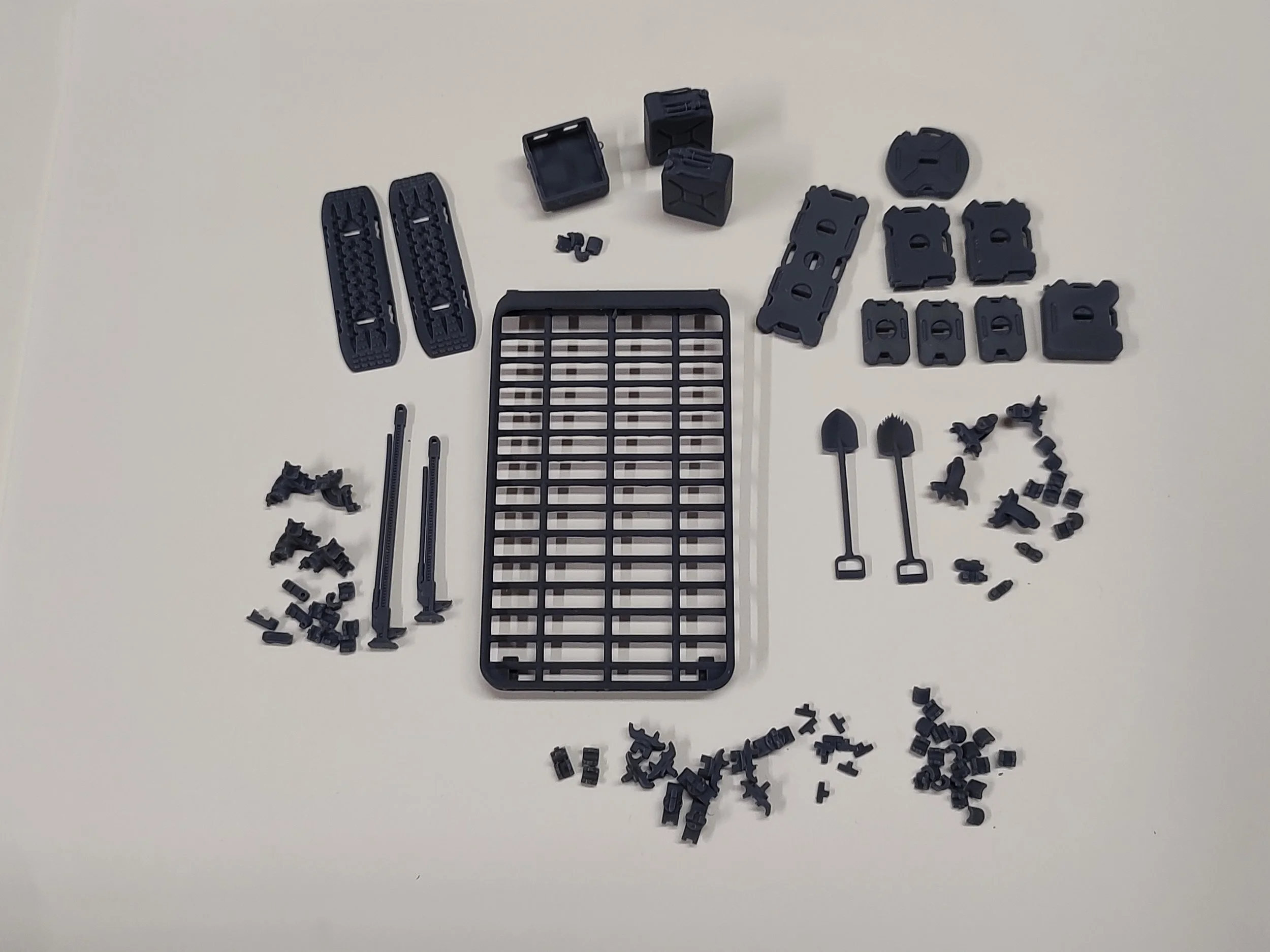 Kit includes 94 pieces ( Basket, 18 pc jack kit including both 48 and 36 in Hi-Lift style jacks and basket mounts and clamps, 18 pc shovel kit including 2 trail shovels and basket mounts and clamps, 7 pc NATO style jerry can kit including 2 jerry cans, 2 can rack and clamps, traction boards x2, 8 pc Roto-Pax style container kit including 1 gallon x3, 2 gallon x2, 3 gallon x1, 4 gallon x1 and 8.5 L round, 40 piece basket mounts and clamps package)