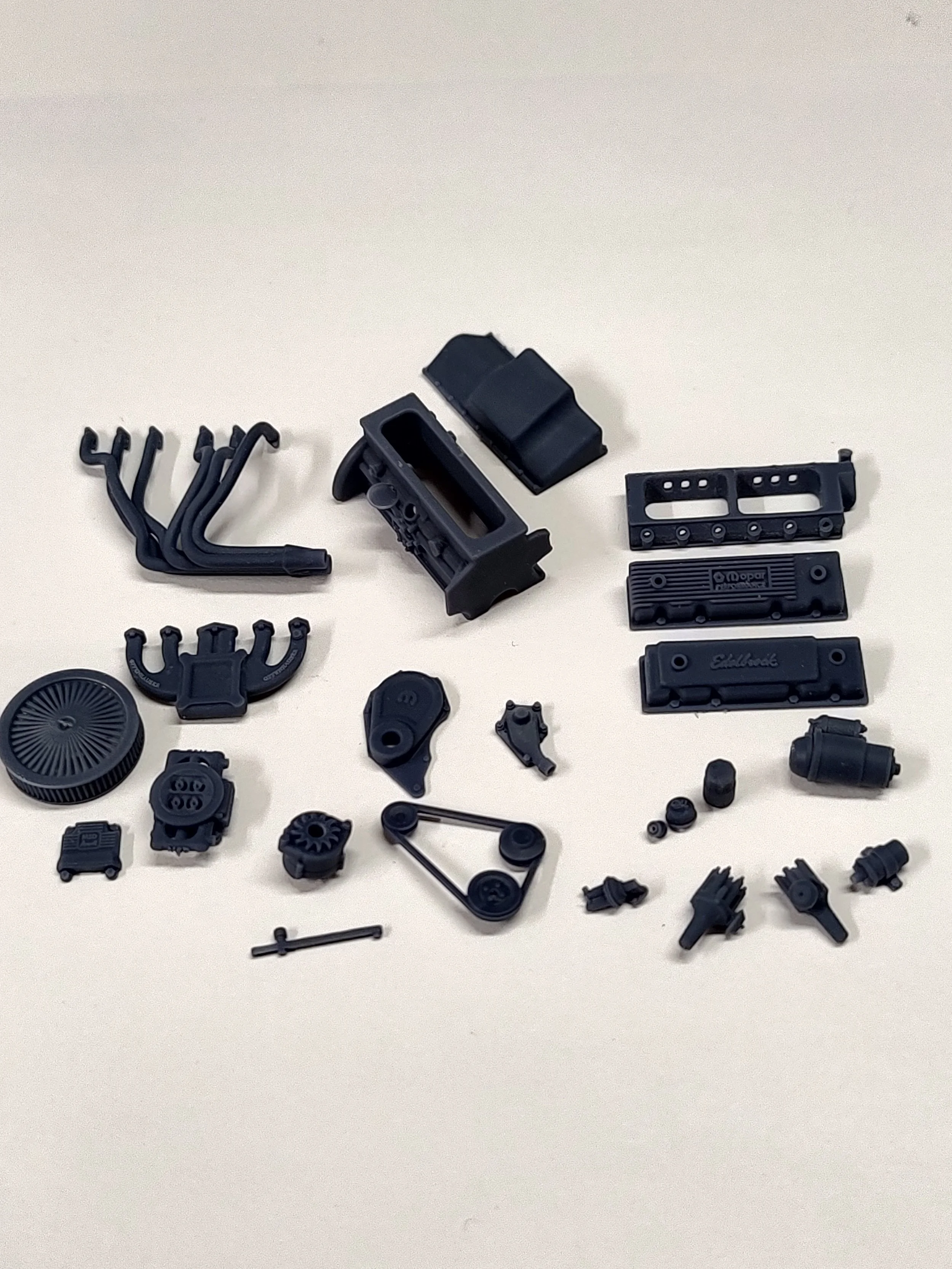 Engine kit includes 24 pieces (Engine block, cylinder head, low profile engine oil pan, smooth Edelbrock valve cover, Mopar Performance valve cover, 4 barrel Offenhauser intake manifold, long tube exhaust header, Mopar performance timing cover, water pump, fuel pump, Holley 4150 Performance carburetor, MSD Atomic style 4 barrel EFI throttle body, EFI Controller, oil filter, oil fill cap, oil breather valve, alternator, alternator bracket, starter, cross bolt ignition coil, hollow center distributor, solid center distributor, pulleys with attached belt, K&N Xtreme style air filter)